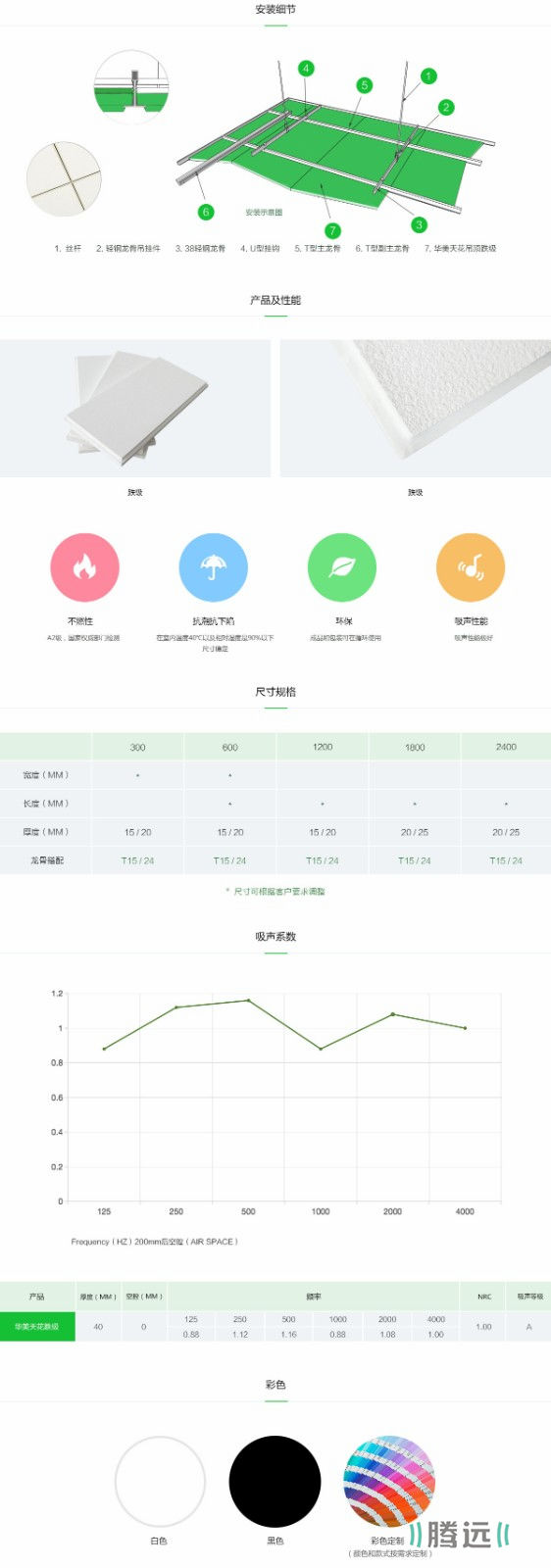 主营各类天花系列、岩绵系列、穿孔系列、玻纤系列、软包系列、悬挂系列